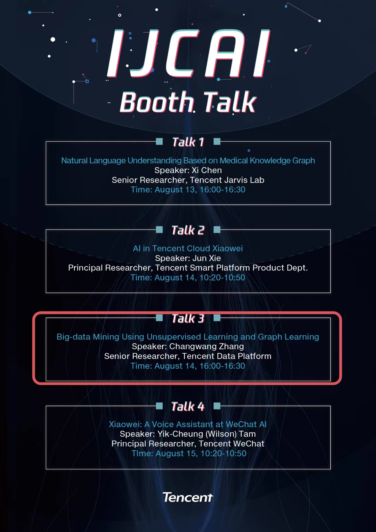 - C Zhang. Panel Talk: Big-data Mining Using Unsupervised Learning and Graph Learning. IJCAI-Tencent Academic and Industrial Conference, 2019. (pdf poster)
