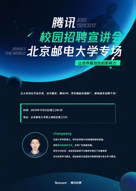 - C Zhang. Tencent Campus Recruitment Talk - Beijing University of Posts and Telecommunications. Beijing University of Posts and Telecommunications, 2020. (pdf poster)
