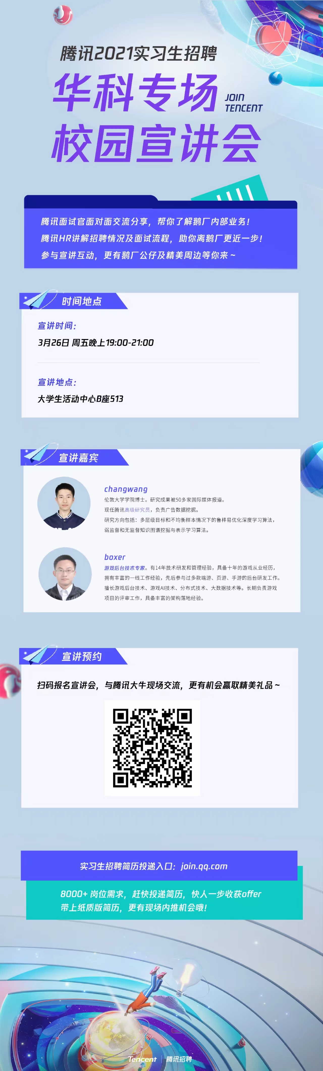 - Official technical interviewer & speaker for the offline on-site campus recruitment of Tencent